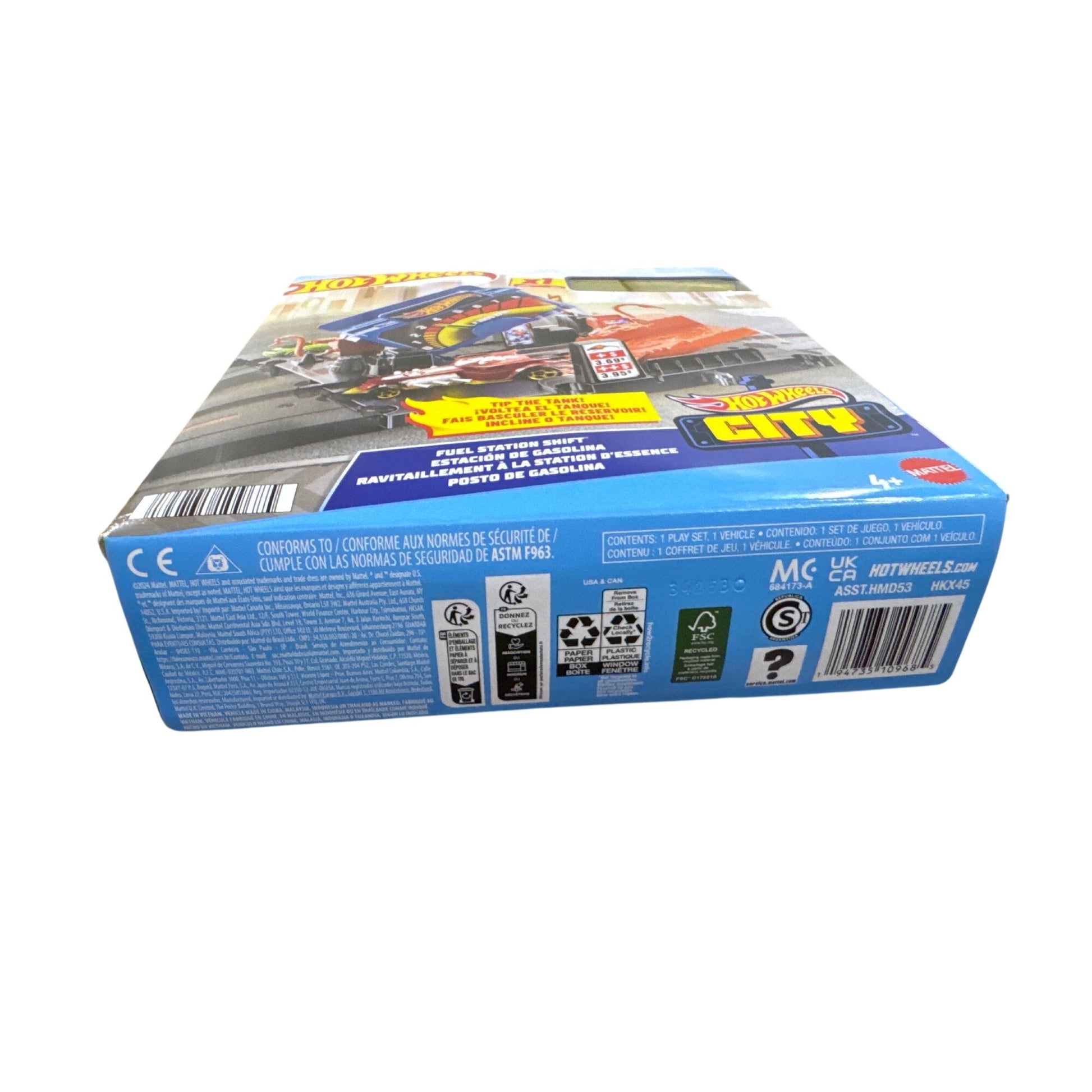 This Hot Wheels City Fuel Station Shift playset includes interactive features like a tipping fuel tank and a race car. Designed for kids aged 4 and up to enjoy imaginative play.