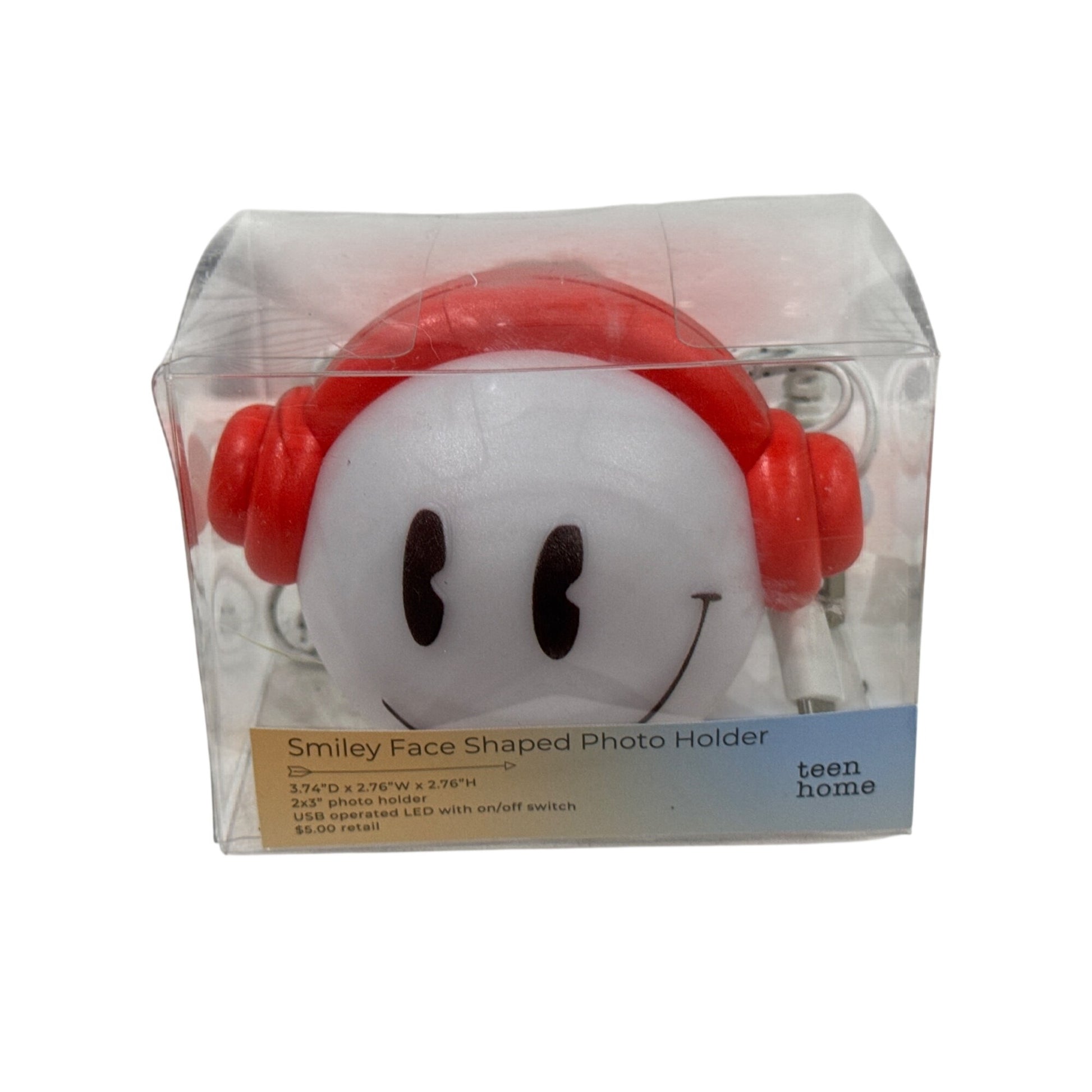 A fun and functional smiley face-shaped photo holder with red headphones. USB-powered LED light adds a playful glow to your photos. Portable and compact design.